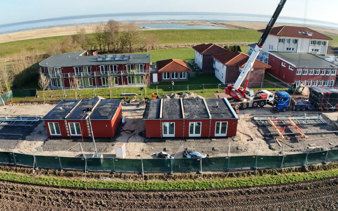 Für die Erweiterung der Jugendherberge Schillighörn haben wir 15 neue Moduleinheiten vollständig witterungsunabhängig bei uns in Bremervörde vorgefertigt. Zusammen bilden sie 4 Deichhäuser. Per Schwerlastkran wurden die Module innerhalb weniger Minuten millimetergenau auf ihre Fundamente gesetzt – leise und nahezu ohne Einschränkungen für den laufenden Betrieb. Ökologisch, langlebig