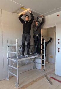 Für die Erweiterung der Jugendherberge Schillighörn haben wir 15 neue Moduleinheiten vollständig witterungsunabhängig bei uns in Bremervörde vorgefertigt. Zusammen bilden sie 4 Deichhäuser. Per Schwerlastkran wurden die Module innerhalb weniger Minuten millimetergenau auf ihre Fundamente gesetzt – leise und nahezu ohne Einschränkungen für den laufenden Betrieb. Ökologisch, langlebig